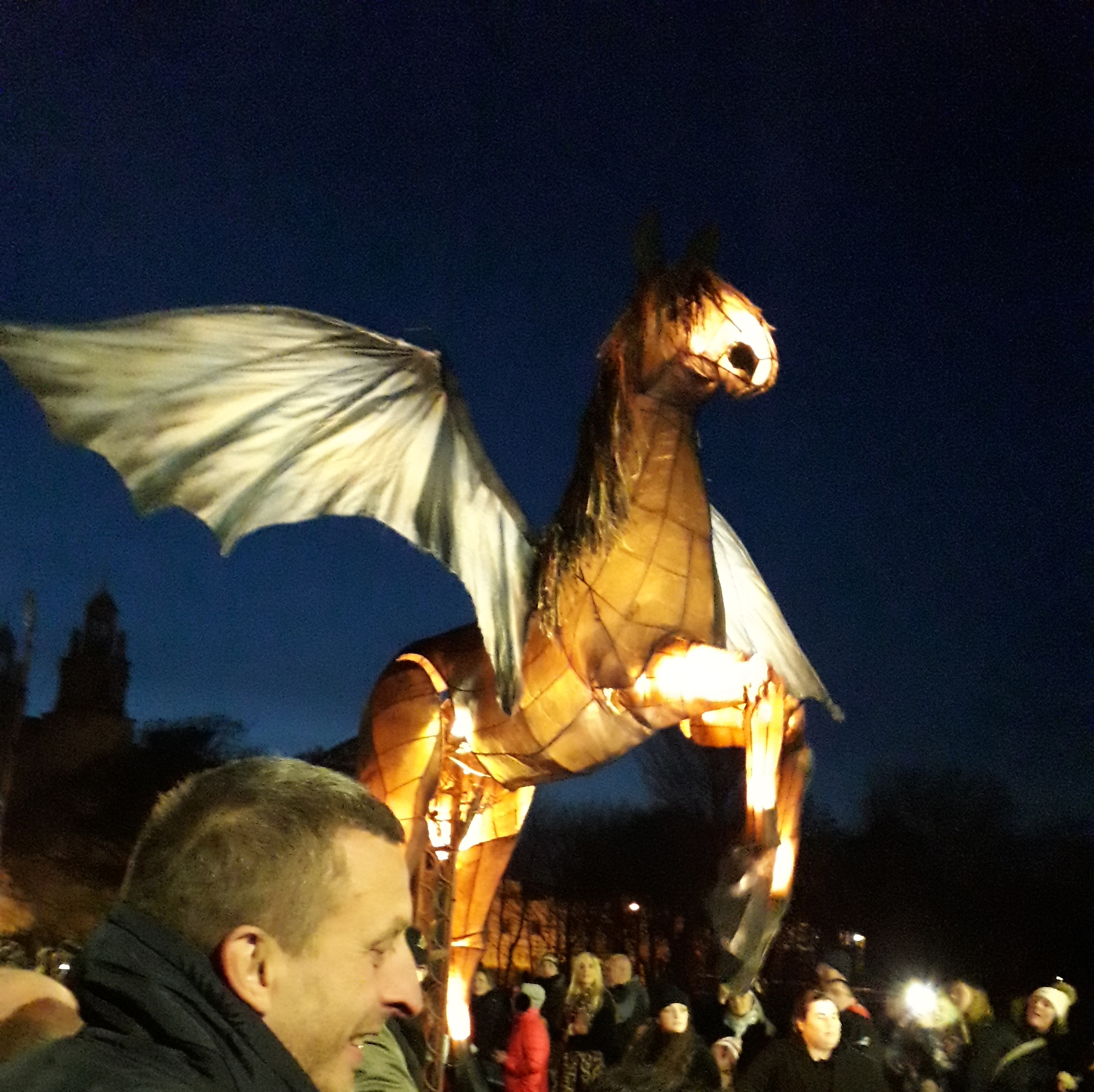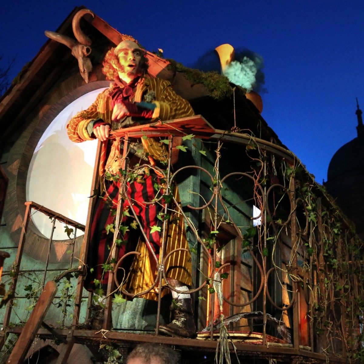 遊行慢慢接近,一隻巨型飛馬緩緩經過,前幾屆好像也有出現過。接著出現的是以人扮狼群為首的隊伍,引領出一個超大的巨人,我猜應該是《傑克與豌豆》(Jack and the Beanstalk)的故事,因為巨人旁邊跟了一堆「樹枝人」走來走去。巨人走到橋墩時,剛好在我面前停了下來,微微傾向我的方向,右手手指直接正對著我的手機錄影,距離真的有夠近,本來還在想說巨人的指頭會不會直接就抵到我的鏡頭了。